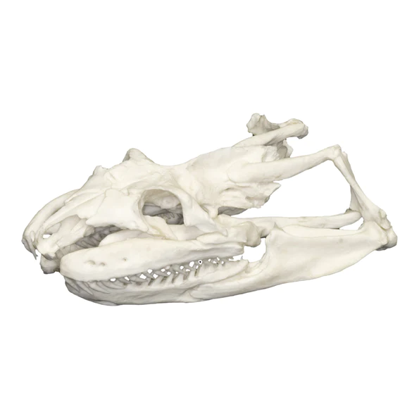 An **anaconda skull** is highly adapted for capturing and swallowing large prey. It features flexible joints, enabling the jaw to open wide, and sharp, recurved teeth arranged in multiple rows for gripping prey. The elongated skull and wide gape allow the anaconda to consume animals much larger than its head. This skull structure reflects the snake’s role as a powerful constrictor.
